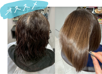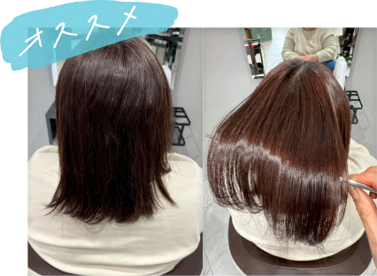お客様それぞれの足りない栄養素をいれながらの髪質改善ストレート、艶が長続きし、回数を重ねる程に日が経過しても収まる髪質になっていきます。この手触りはやった人全員感動されています。